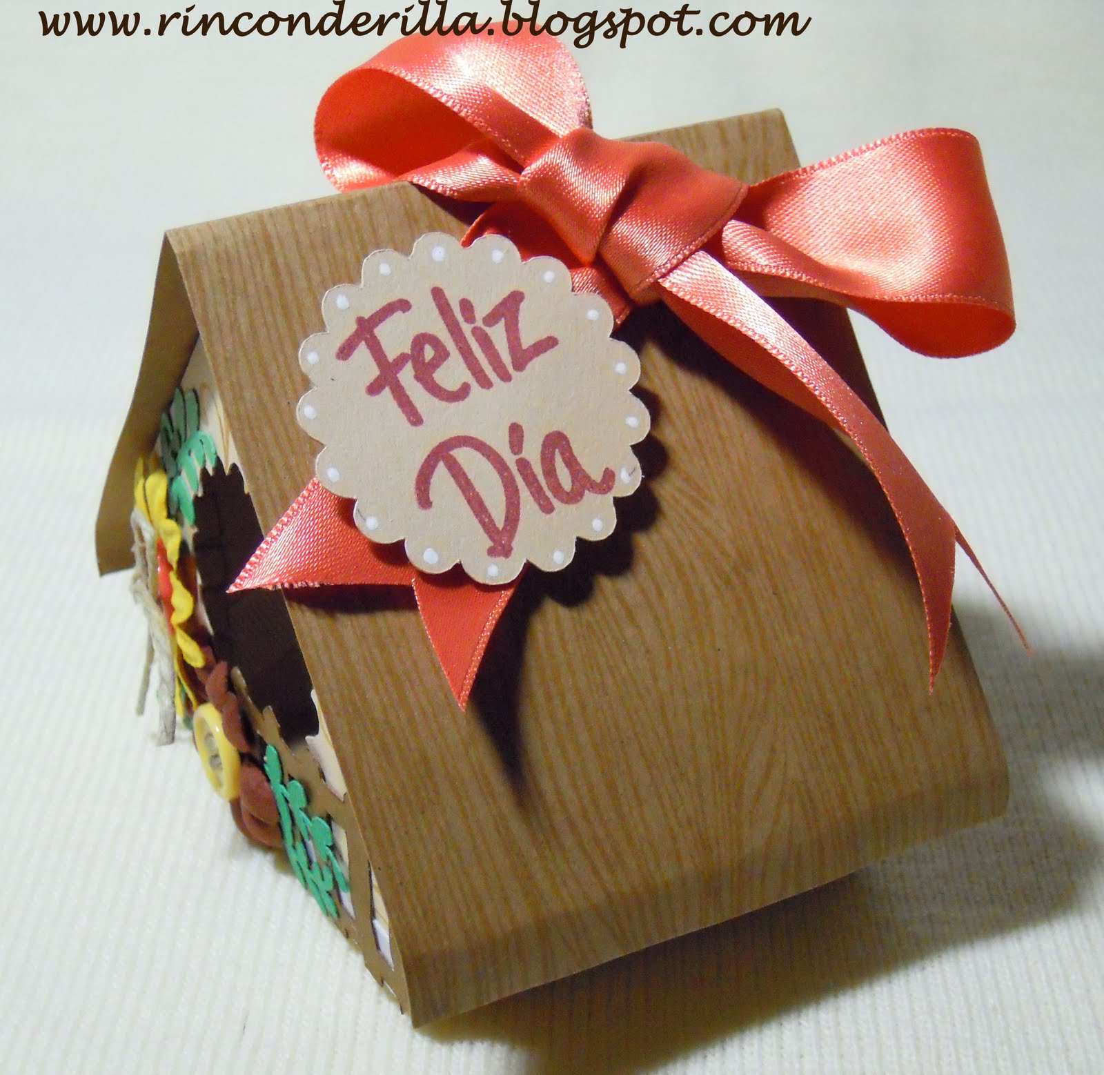 La base de esta casa, es cartulina en color beige, en la que he estampado un sello de Hero Arts Cling® Flourish Background, el tejado está hecho con el sello de Hero Arts® Designer Woodgrain. El mensaje de Feliz Día es de Stampendous® Spanish Messages, que está sobre un scallop y en él he añadido unos puntitos con un boli de gel blanco.